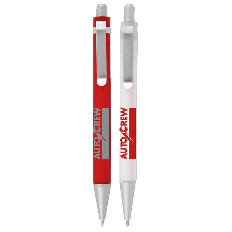 ARTICA kunststof balpen Peekay. Kunststof houder in actuele frosty kleuren, mat-verchroomde metalen clip en aluminium-kleurige kunststof drukker en puntstuk. Voorzien van blauwschrijvende plastic langschrijfvulling.